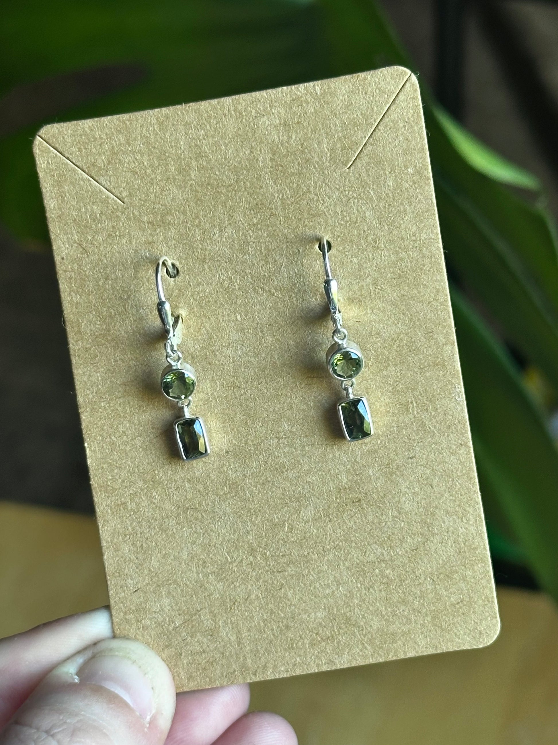 Faceted Gemstone Moldavite Sterling Silver Dangling Clasp Earrings